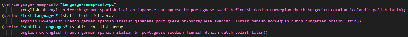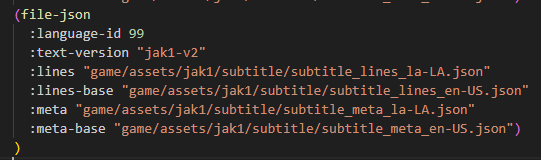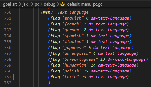 *text-languages*and*subtitle-languages*lists ingoal_src/{GAME_NAME}/pc/progress-pc.gc. Maintain the order by the numeric ID (ie.englishis0so it comes first). If your language was brand new you should also add it to*language-remap-info-pc*in a similar fashion.