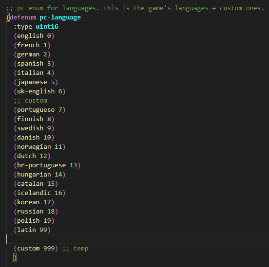 goal_src/{GAME_NAME}/pc/pckernel-impl.gcand look at thedefenum pc-languagelist, - If your language is not on this list, add it with a clear name and unique ID. For example