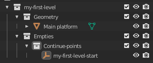 The empty will serve as a point in space we can always look back at and change. Name it the same as the name of the continue-point in level-info.gc, so you can easily know what it is and find it through the search.