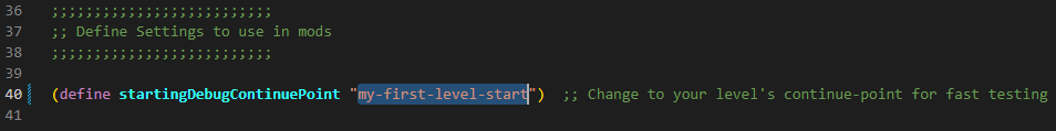 If you were to try to go in the game right now, you would still not be able to find your continue-point in the list. We first need to tell the compiler to add it. To do so, go to the bottom of the level-info.gc file.